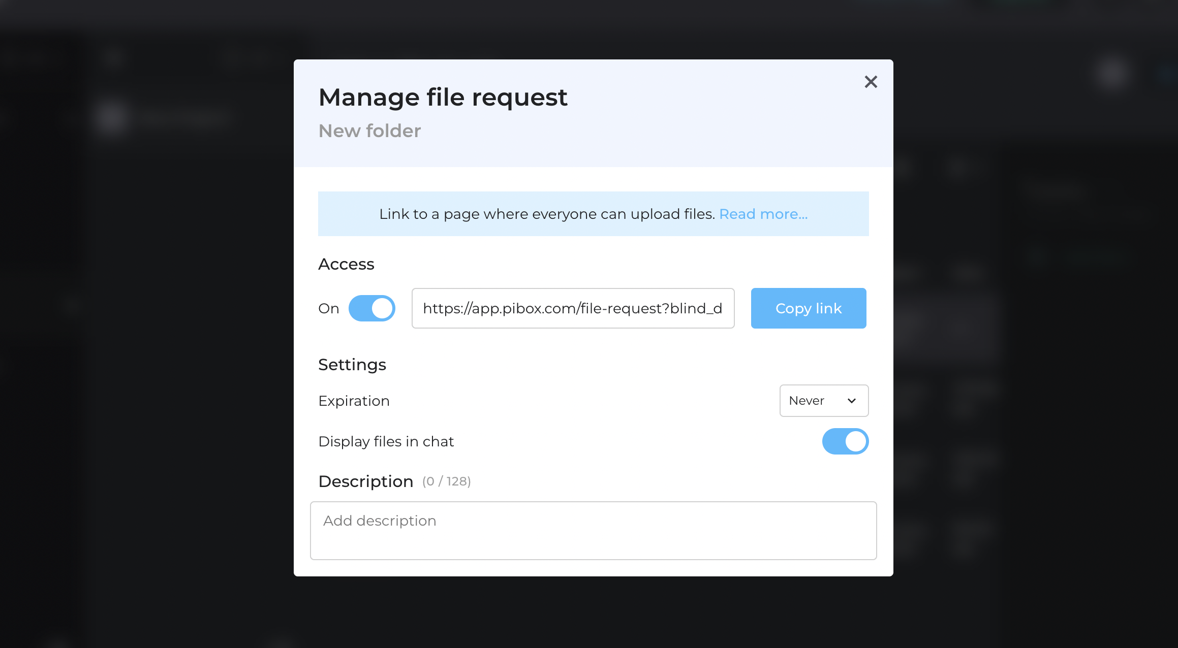 Like Dropbox, Pibox lets you create a secure File Request link that anyone can use to upload assets, no account required.
